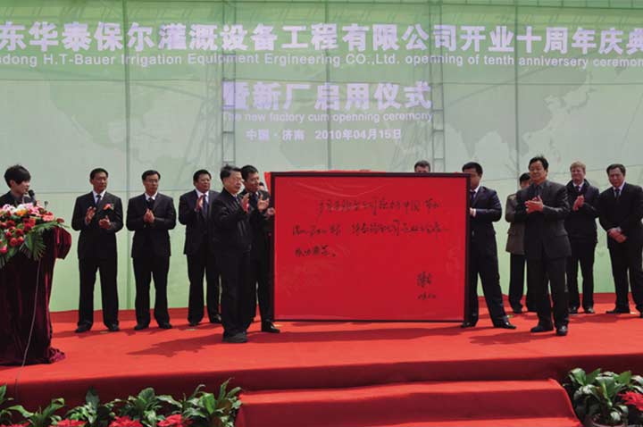 2010年華泰保爾成立十周年,4月15日在華泰保爾新廠區(qū)舉行盛大的慶典及新廠啟用儀式,水利部、山東水利廳、濟南市高新區(qū)領(lǐng)導(dǎo)及奧地利駐華大使及商務(wù)參贊、奧地利BAUER公司CEO、奧地利AME公司CEO等受邀參加慶典。