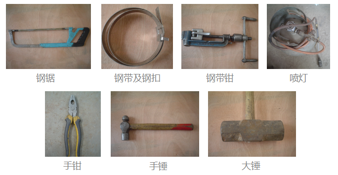所需工具:鋼鋸、鋼帶、鋼扣、鋼帶鉗、噴燈、大錘、手鉗、手錘