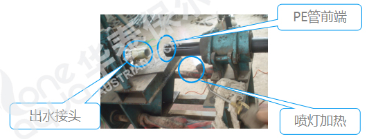 用噴燈加熱PE管。加熱時(shí)PE管后半部分應(yīng)比前半部分稍硬(PE管接頭端面為前)