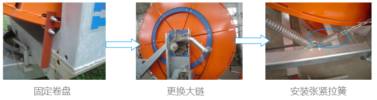PE管沒有出現(xiàn)松亂現(xiàn)象可直接固定卷盤,更換大鏈。