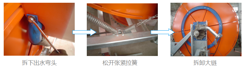 拆下卷盤上的PE管出水彎頭和大鏈。 |