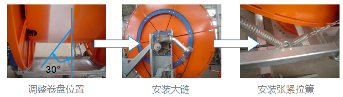 轉(zhuǎn)動(dòng)卷盤,使U型口與垂直方向的夾角約為30° ,安裝大鏈 |