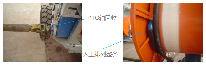通水或使用PTO軸收回PE管(回收時(shí)卷盤上的頭幾圈的PE管必須人工排整齊)。