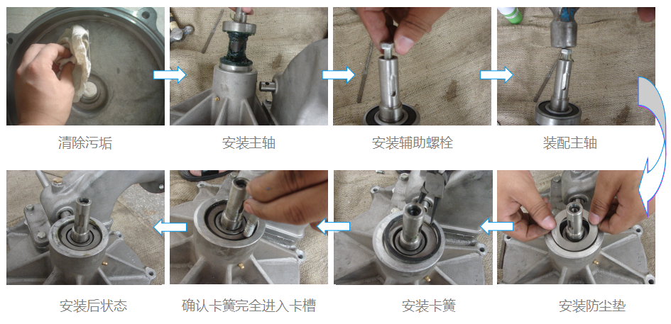 清除水渦輪殼體上的污垢,主軸的軸承涂潤(rùn)滑脂后裝入水渦輪,安裝彈性擋圈 |