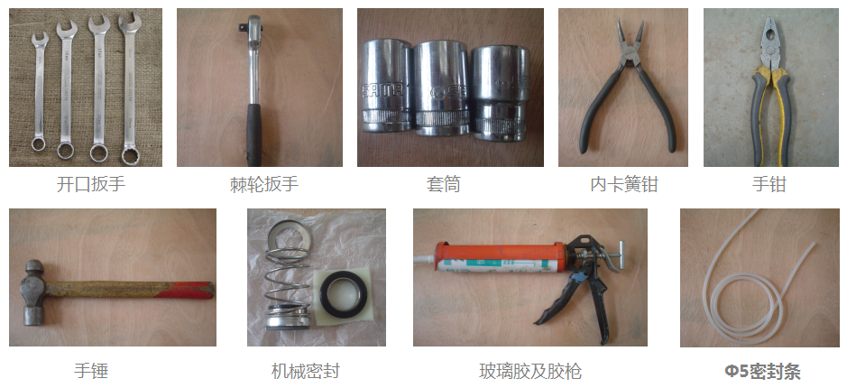 所需工具及物品:13#、16#、17#、18#開口扳手、16#、17#、19#套筒、棘輪扳手、內(nèi)卡簧鉗、手錘、手鉗、機(jī)械密封、玻璃膠、Φ5密封條、玻璃膠槍。 |