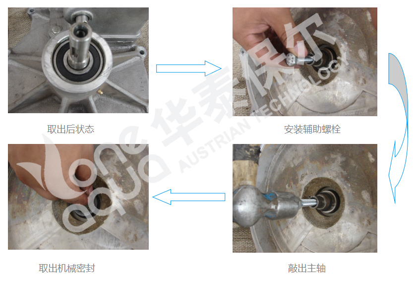 拆下水渦輪皮帶輪及主軸處彈性擋圈,在主軸葉輪側(cè)上一M10螺栓,用手錘敲打螺栓擊出主軸。取出機(jī)械密封的靜環(huán)。