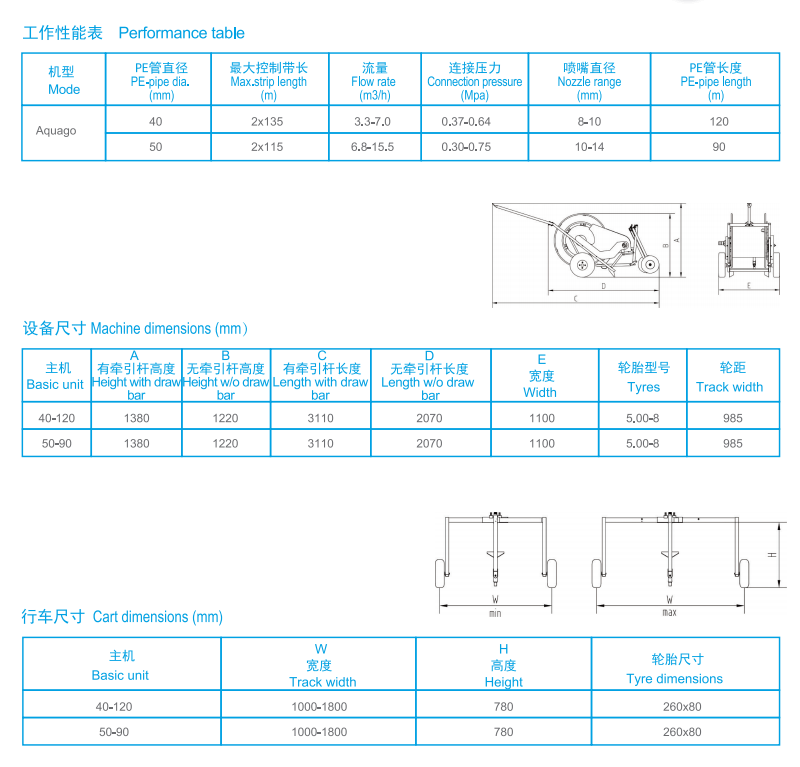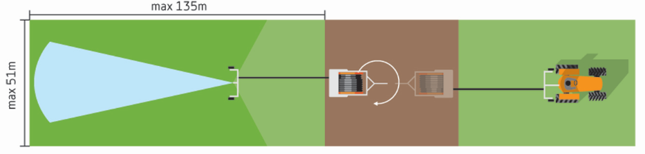 強(qiáng)勁的回收動(dòng)力 即使在很低的流量情況下,噴水小車(chē)仍然可以快速回收,最快可達(dá)35米/小時(shí)的回收速度,使根據(jù)作物需求調(diào)節(jié)灌溉量變得輕而易舉。 | 大尺寸輪胎 5.00-8的大尺寸輪胎使噴灌機(jī)即使是在非常崎嶇、泥濘的路面上也可以穩(wěn)定、方便地移動(dòng)。 | 高效防腐蝕 車(chē)架和噴水小車(chē)均采用熱鍍鋅鋼件,為金屬部件提供了防腐保護(hù),具有長(zhǎng)久的使用壽命。 |